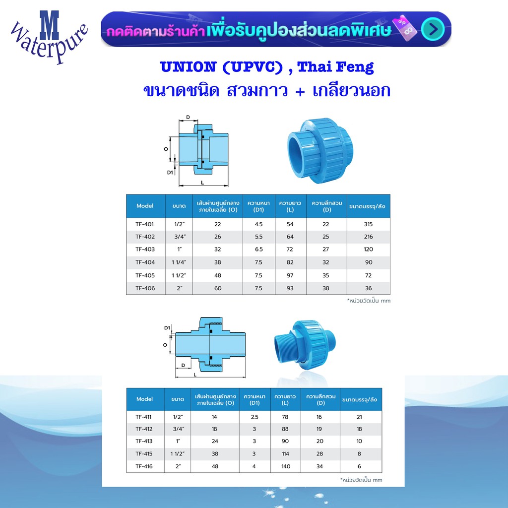 UNION PVC ยูเนียน พีวิซี 1 นิ้ว ชนิดสวมกาว หรือ เกลียวนอก ใน