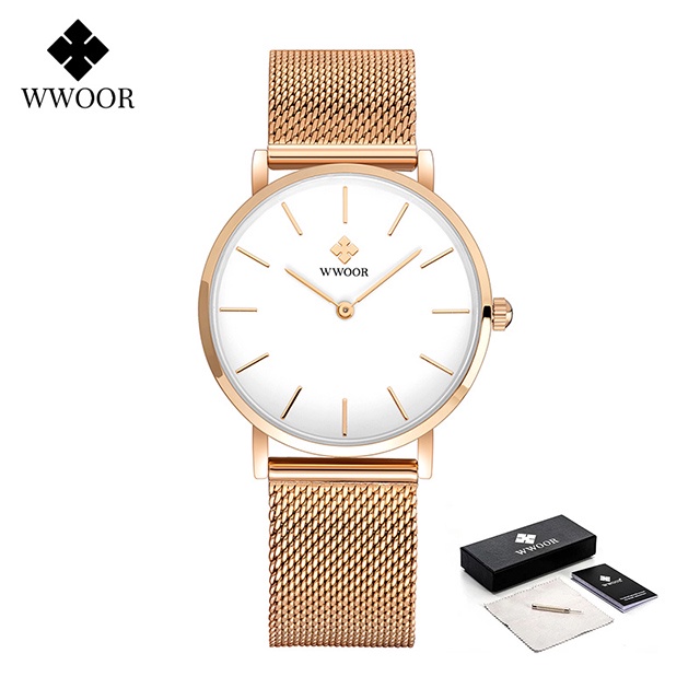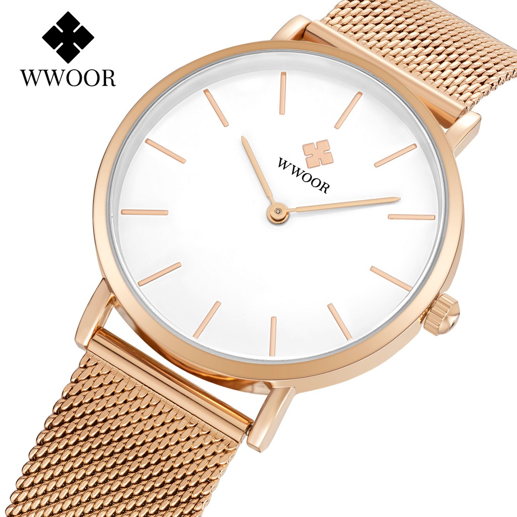 WWOOR แบรนด์ชั้นนำแฟชั่นลำลองสุภาพสตรีนาฬิกาสุภาพสตรีสแตนเลสตาข่ายสายนาฬิกาควอทซ์ฟรีกล่อง 8840