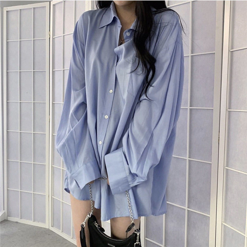 mimi&didi พร้อมส่ง เสื้อเชิ้ตแขนยาวคอปกผู้หญิง เสื้อโอเวอร์ไซส์ เก๋ไก๋ สไตล์เกาหลี หลวม สีฟ้า/สีขาว#637