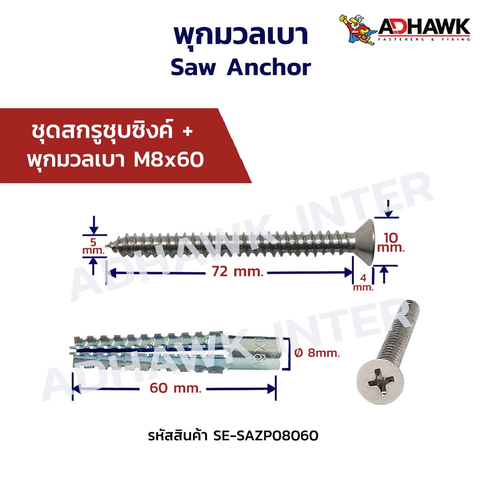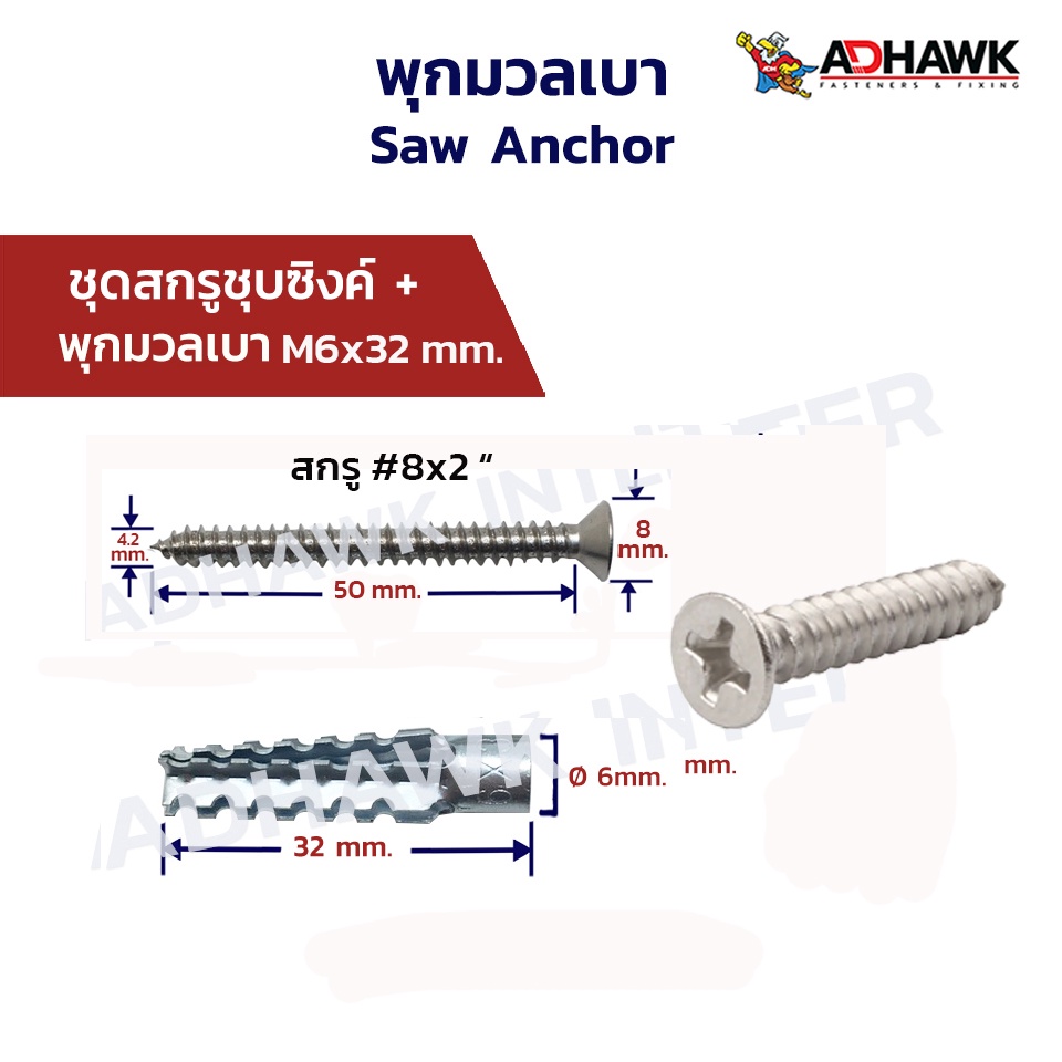 ชุดพุกมวลเบา+สกรูเกลียวปล่อยเหล็กชุบซิงค์ขาว พุกติดตั้งผนังมวลเบา ขนาด M6x32mm.,M8x60mm.