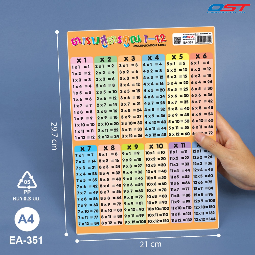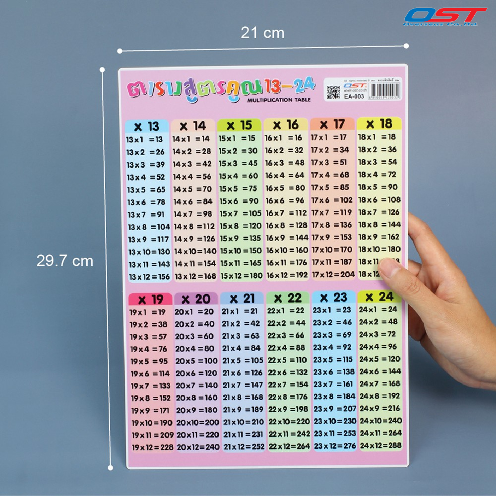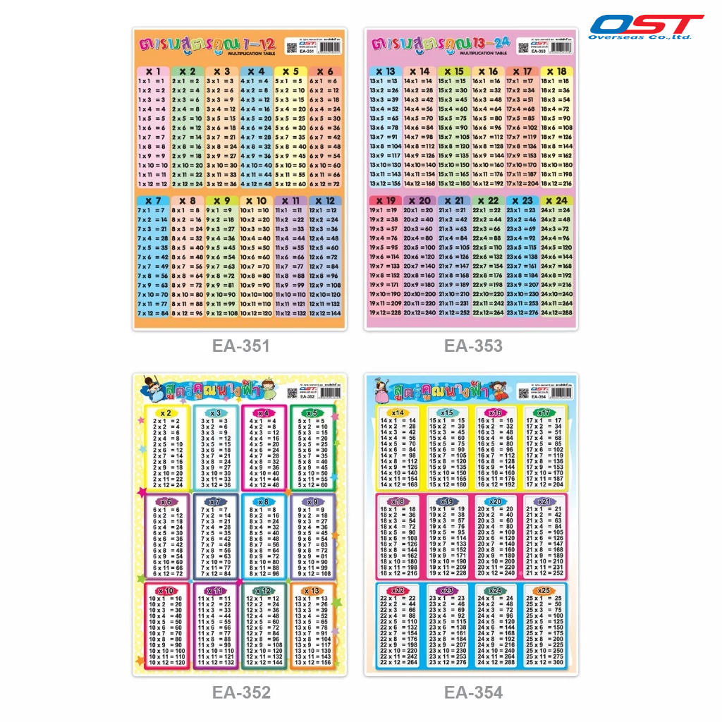 แผ่นความรู้พลาสติก ขนาด A4 ( สูตรคูณแม่ 1-12, สูตรคูณแม่ 13-24, สูตรคูณแม่ 2-13, สูตรคูณแม่ 14-25)
