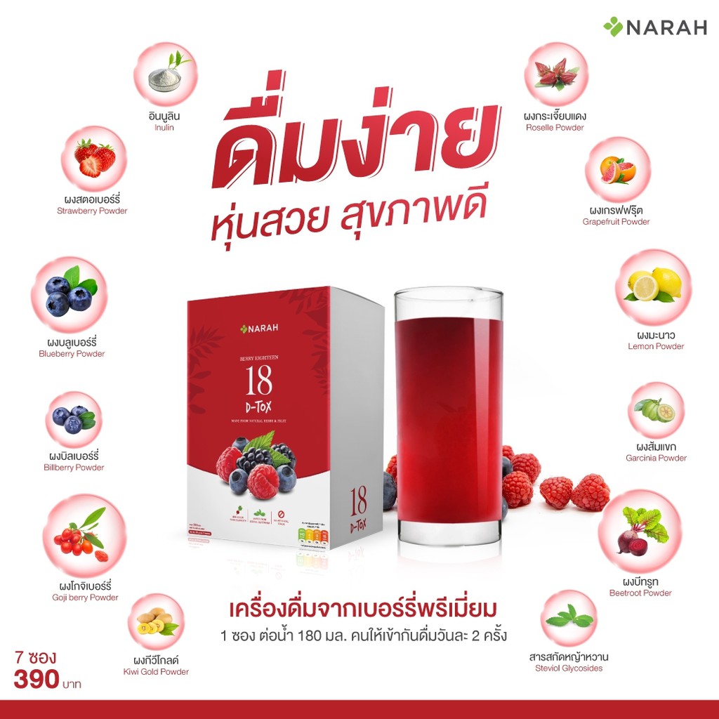 NARAH BERRY EIGHTEEN (นราห์) มีวิตามินรวมผักผลไม้สกัด 10+ชนิด (1กล่อง/7ซอง)