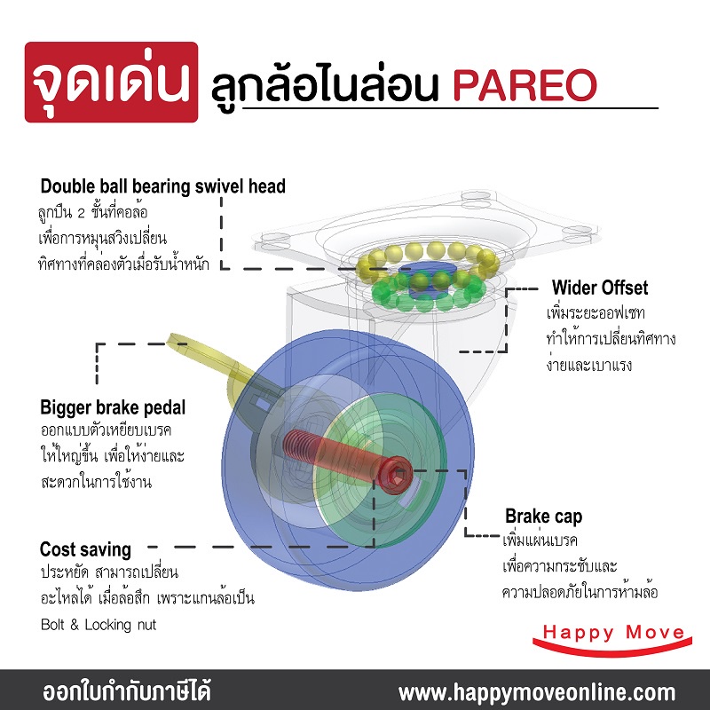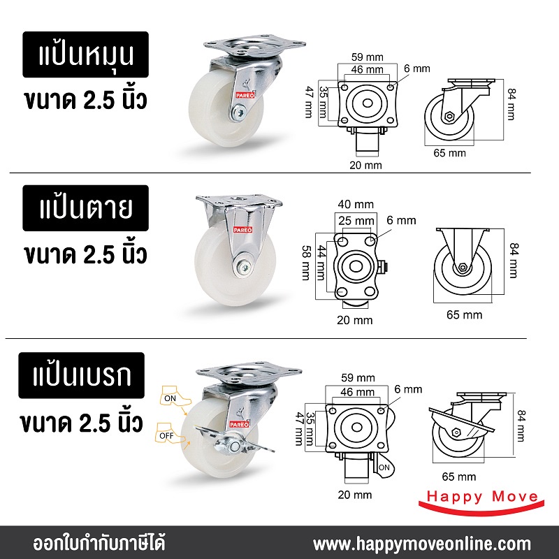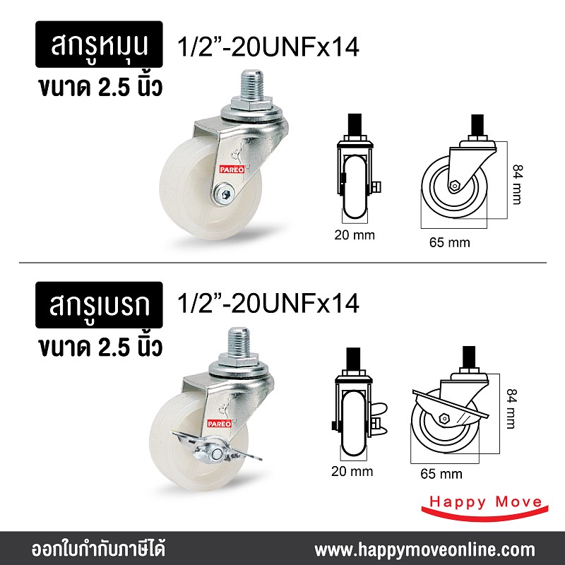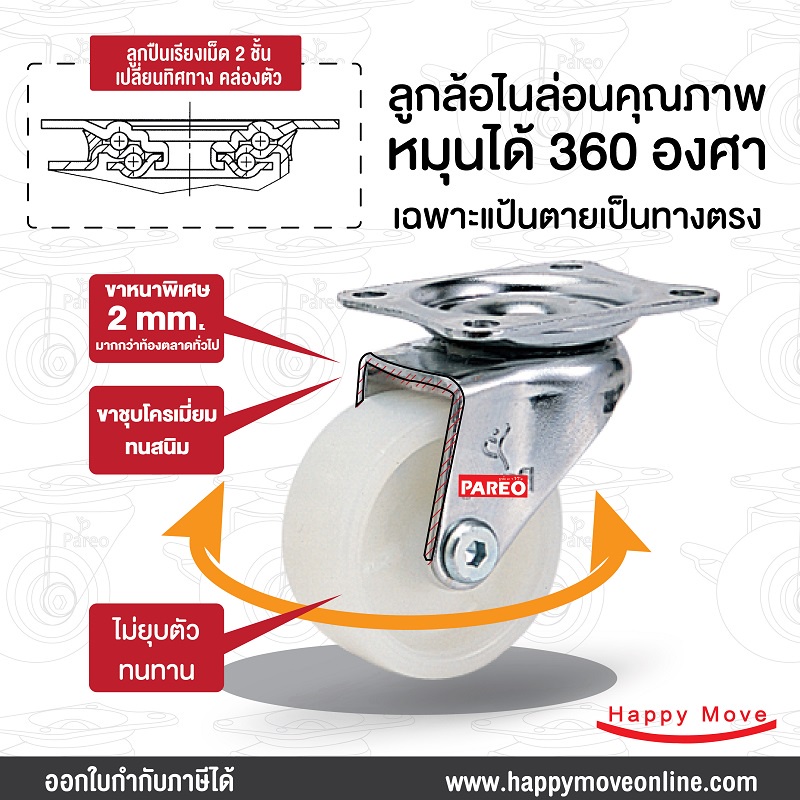 ลูกล้อไนล่อน รูบู๊ช 2.5 นิ้ว (65มม.) รับน้ำหนัก 35-53 กก. รุ่น Compact ยี่ห้อ PAREO พร้อมส่ง
