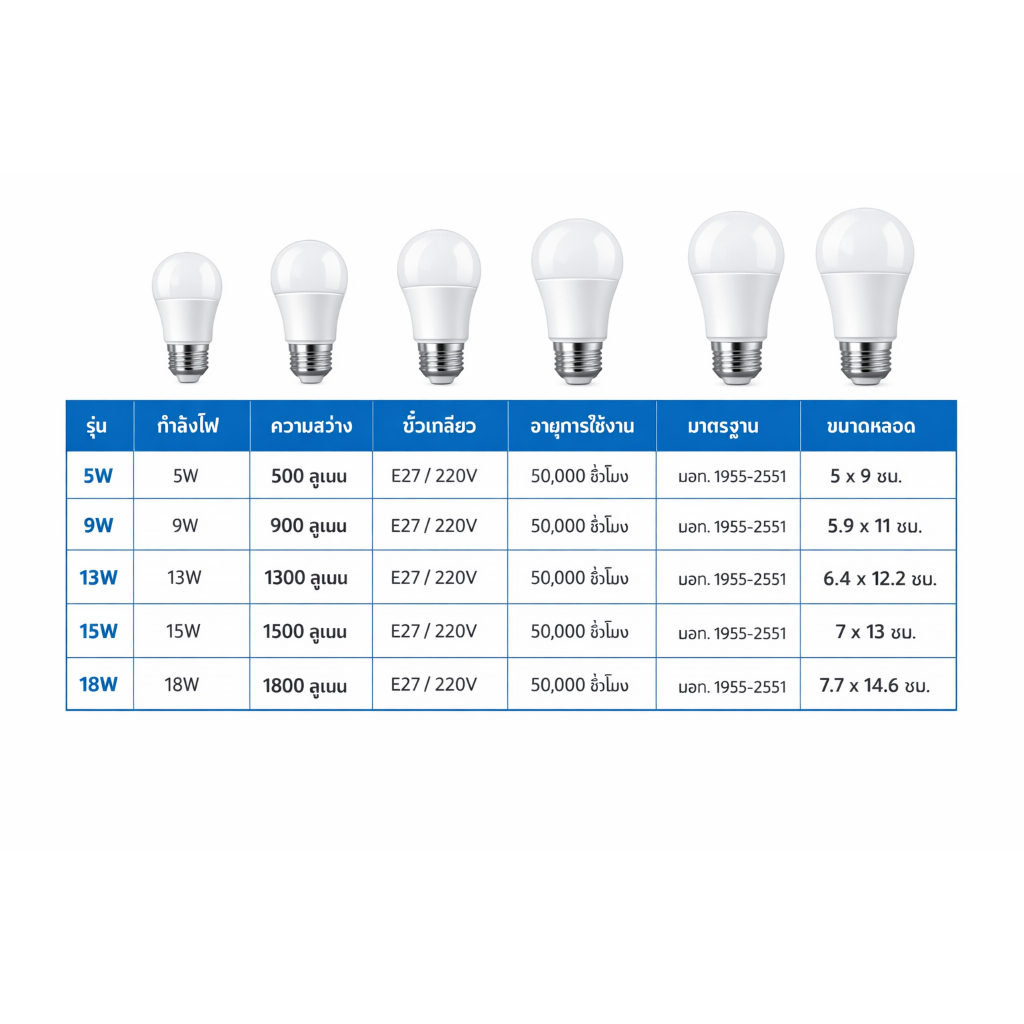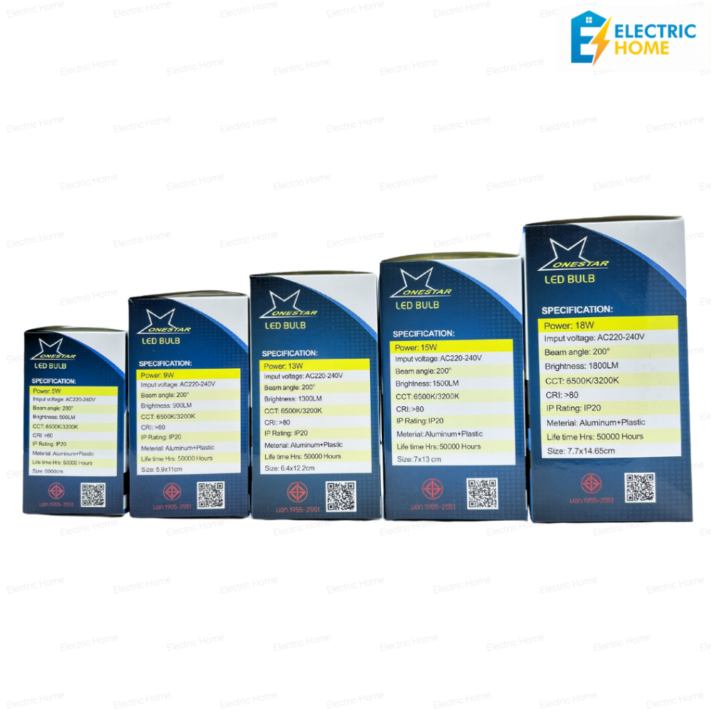 ONESTAR หลอดประหยัดไฟ LED ขั้ว E27 หลอดไฟกลม สีขาว Daylight เลือกขนาด 5W/9W/13W/15W/18W ใช้งานได้ 50,000 ชม.