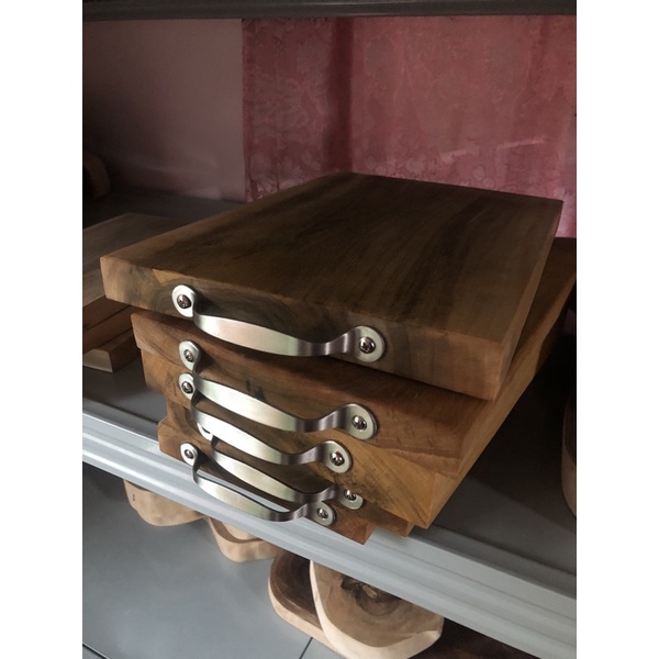 เขียงไม้ตะพรุนหิน แบบเหลี่ยม (A) พร้อมหูหิ้วสแตนเลสอย่างดี #แช่น้ำเกลือแล้ว พร้อมใช้งาน