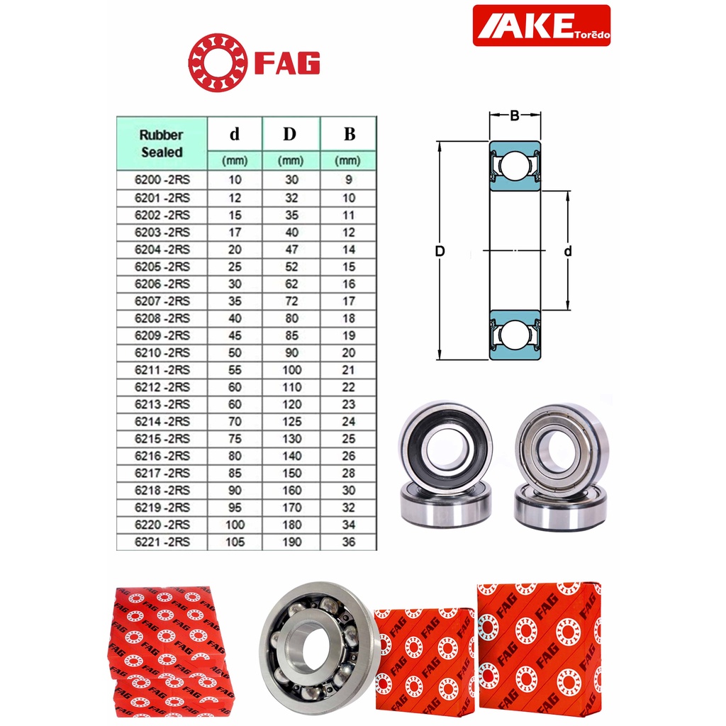 ตลับลูกปืน FAG 6200-2RS 6201-2RS 6202-2RS 6203-2RS 6204-2RS 6205-2RS ตลับลูกปืนลูกปืนรอบจัด ฝายาง 2 ข้าง โดย AKE